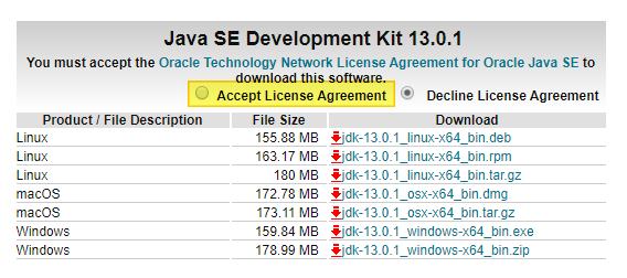 상단 이미지의 하이라이트 처리된 부분 Accept License Agreement의 라디오 체크를 선책해 준 후 자신의 PC에 맞는 OS 환경을 보고 우측의 다운로드 부분을 클릭하여 파일을 받는다.